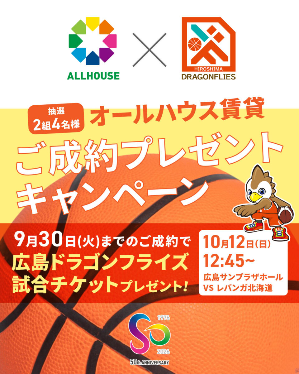 9月末までに 賃貸物件をご契約いただいた方の中で、キャンペーンにご応募いただいたお客様から抽選で 2組4名様 に「広島ドラゴンフライズ観戦チケット」をプレゼント!