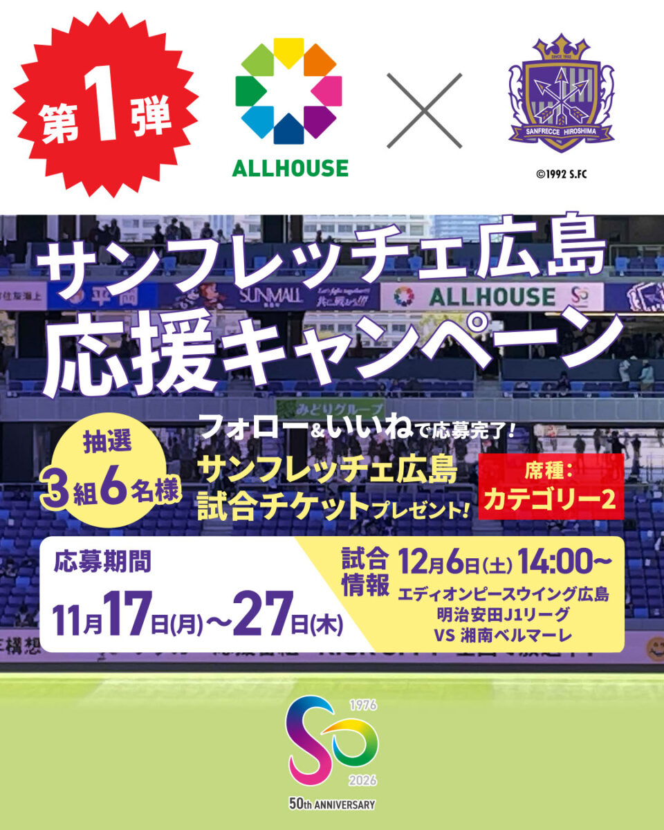 オールハウス創業50周年を記念して、サンフレッチェ広島試合チケットを抽選で3組6名様にプレゼント!