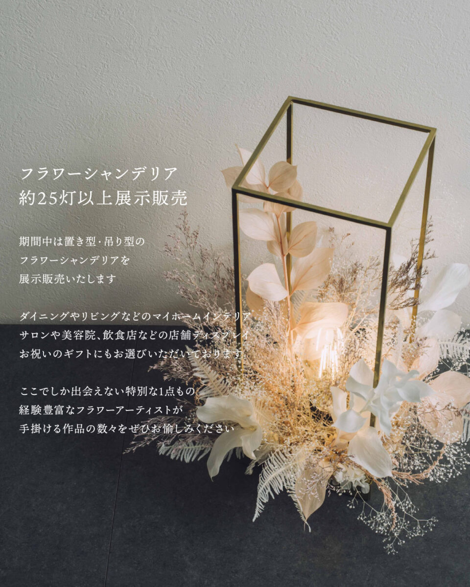 フラワー&シャンデリア専門店「Re:unique」の置き型・吊り型シャンデリアを中心に、約25灯以上のフラワーシャンデリアを展示販売いたします。経験豊富なフラワーアーティストが約40日間、心を込めて手がけた1点ものの照明です。